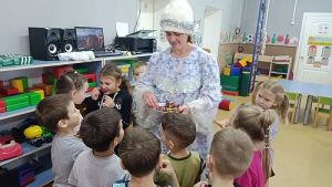 Под легкую «зимнюю» музыку ребята встречали одну из самых любимых сказочных героинь Снегурочку. Мальчишки и девчонки вспоминали вместе с гостьей зимние сказки, стихи, мультфильмы: «Снегурочка», «Дед мороз и лето», «Мороз Иваныч», «Морозко», «Снеговик», «Снежная королева» и др., разгадывали загадки: Во что в русской народной сказке превратилась Снегурочка? (в облачко). Где Родина Деда Мороза? (Великий Устюг). Какой танец исполняется около новогодней елки? (хоровод). Кто спит всю зиму? (медведь) и др.